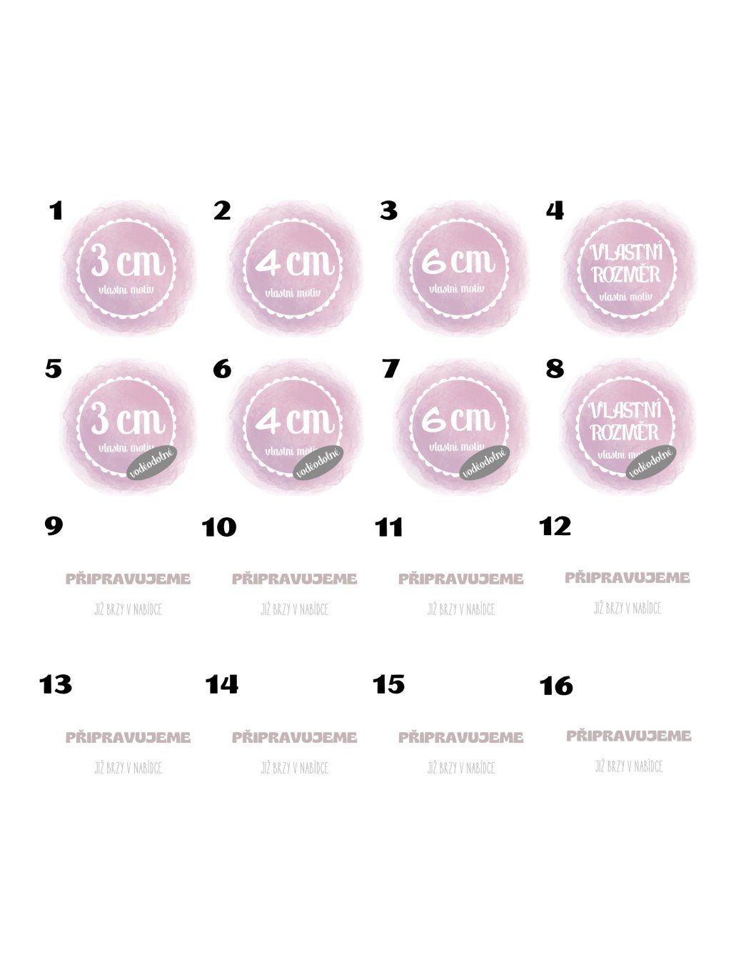 Samolepky jsou tištěný na arch A4, v kulatém rozměru a ve vámi zvolené velikosti.